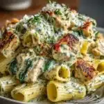 A comforting and delicious creamy pasta dish featuring tender chicken, vibrant basil pesto, and a rich, cheesy sauce.