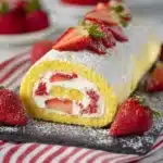Serve: When ready to serve, slice the cake roll into even pieces and place them on a serving platter. Garnish with additional fresh strawberries for that extra touch.