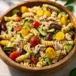 - Combine Ingredients: In a large bowl, combine the pasta, flaked tuna, vegetables, and dressing. Toss gently to coat.