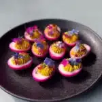 A vibrant twist on classic deviled eggs, colored naturally with beet juice for a sweet and earthy flavor.